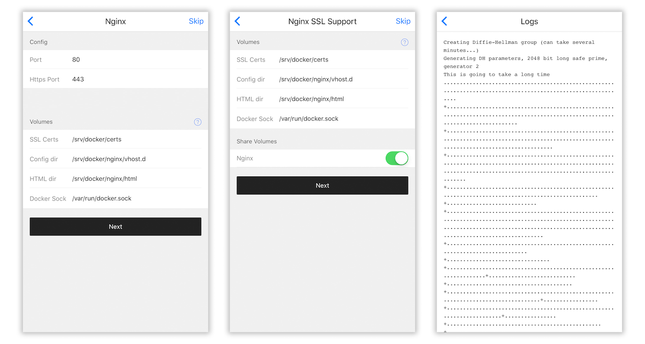 现在,只要在服务器上安装这个应用就可以了,等安装成功后,稍等两分钟你在浏览器中打开 https://你的域名 应该就可以访问了!你也可以查看 Nginx SSL Support 的日志,里面会有过程记录。证书生成后会默认保存在 /srv/docker/certs/ 目录下面(如果你没有改配置的话)。
